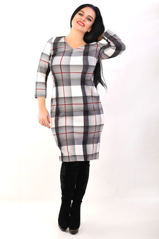 Sukienka dzianinowa z rękawem 3/4, krata popiel, czerwień