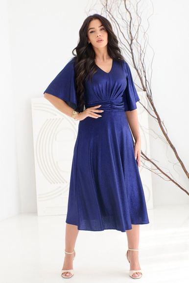 Granatowa lekko błyszcząca sukienka rozkloszowana midi LUMINA Plus Size – drapowanie i lekkość