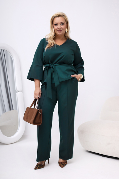 Komplet wizytowy plus size LUXARIA w kolorze butelkowej zieleni to kwintesencja kobiecego stylu. Bluzka z delikatnym wiązaniem w talii i efektownymi rękawami dodaje lekkości, a spodnie z elastyczną gumką z tyłu gwarantują wygodę i elegancki wygląd.